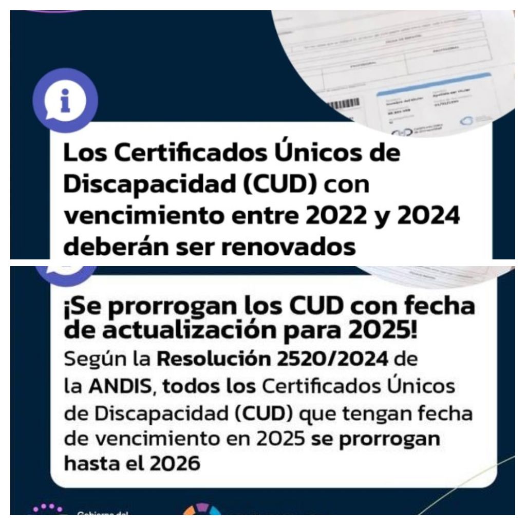 Según la Resolución 2520/2024 de la ANDIS, todos los Certificados �?nicos de Discapacidad (CUD) con vencimiento en 2025 se prorrogan automáticamente hasta 2026.