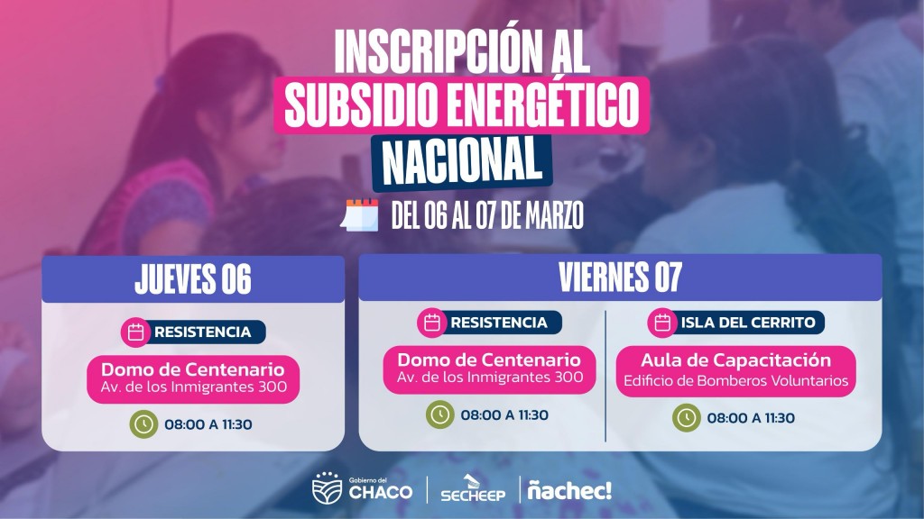 _En el marco de la iniciativa impulsada por el Gobierno Provincial, el Servicio Energético del Chaco, el Ministerio de Desarrollo Humano, a través del Programa Ñachec, y con la colaboración de Ecom Chaco, se llevará a cabo un operativo de inscripción para el subsidio eléctrico nacional._