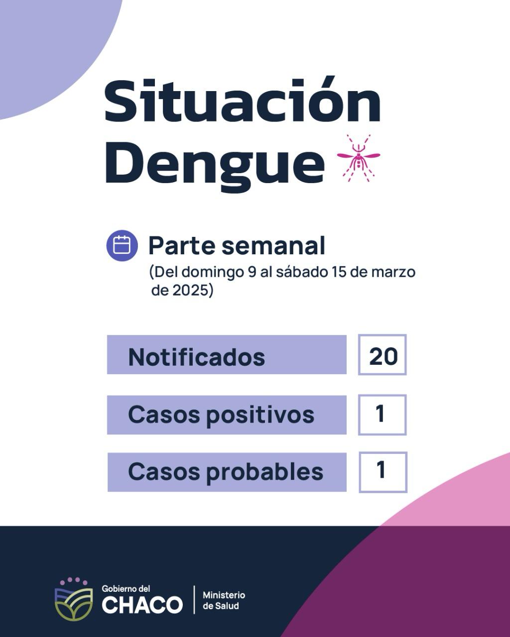 Durante ese lapso se registraron 20 notificaciones, 1 caso positivo (en Charata) y 1 caso probable.