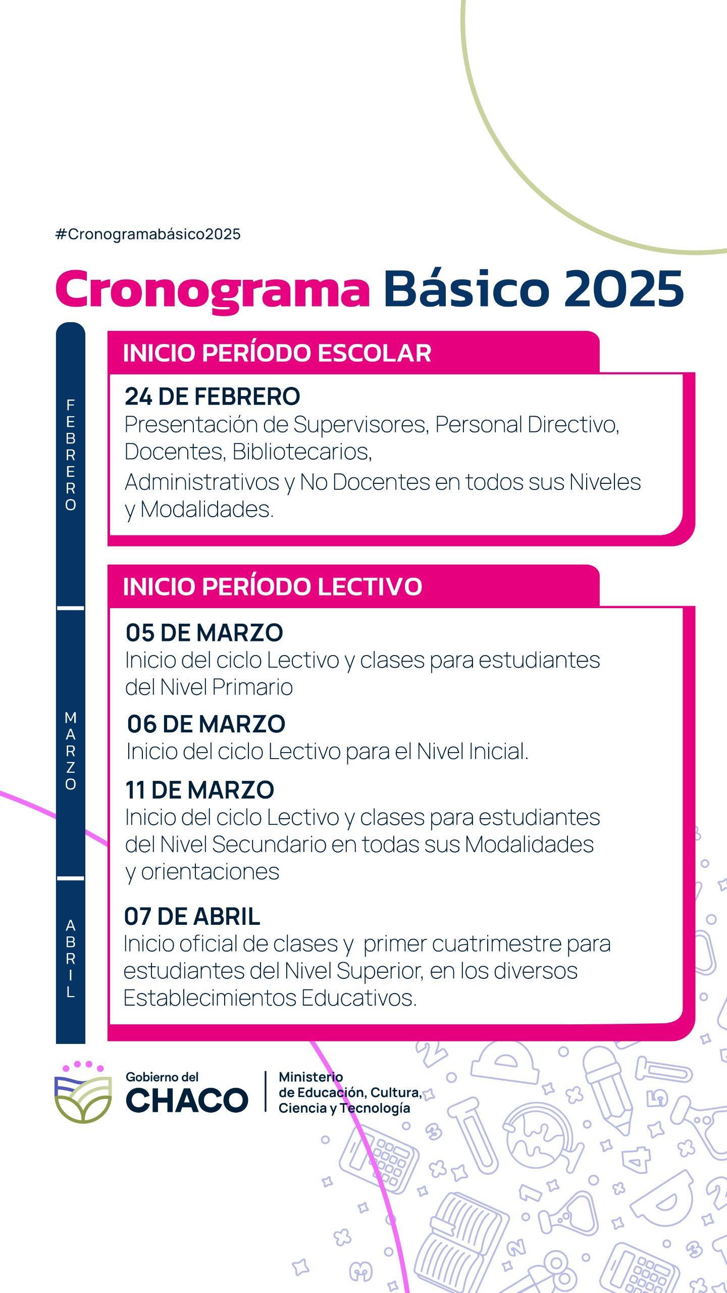 *CALENDARIO ESCOLAR 2025: EN MARZO SE INICIARÁ EL CICLO LECTIVO EN EL CHACO* *El Ministerio de Educación informó que el 24 de febrero se iniciará el período escolar con la presentación de los docentes y no docentes a sus lugares de trabajo. En tanto que el 5 de marzo, comenzará el ciclo lectivo 2025 con el inicio de las clases en las instituciones de nivel Primario; el 6 del mismo mes será el turno de los jardines de infantes; y el 11, de las escuelas secundarias.* El Ministerio de Educación, Cultura, Ciencia y Tecnología de la Provincia del Chaco dio a conocer el Calendario Básico Escolar 2025, que se estableció por medio de la Resolución Nº 4000/2025. El mismo determina que el período escolar comenzará el lunes 24 de febrero con la presentación de la primera obligación de los supervisores, personal directivo, docentes, bibliotecarios, administrativos y no docentes en las instituciones de todos los niveles y modalidades. En tanto que el miércoles 5 de marzo se iniciará el ciclo lectivo para el nivel Primario (y las modalidades), mientras que un día después (el jueves 6 del mismo mes) comenzará el nivel Inicial. Asimismo, el martes 11 de marzo está previsto el inicio de clase para los estudiantes de nivel Secundario (en todas sus modalidades y orientaciones). El Ministerio de Educación, a cargo de la ministra Sofía Naidenoff, con el inicio de las clases en los tres niveles obligatorios en la primera semana de marzo ratificó el compromiso de la Provincia de garantizar la meta de cumplir con los 190 días de clase fijados por el Consejo Federal de Educación, renovando el desafío de continuar intensificando los aprendizajes para fortalecer la fluidez lectora, la comprensión de textos, la expresión escrita y la resolución de problemas matemáticos de todos los estudiantes. *¿Cómo sigue el cronograma?* El 7 de abril comenzará el ciclo lectivo y el primer cuatrimestre en los institutos de nivel Superior. *Receso escolar de invierno* El Calendario Básico Escolar determina que el receso escolar de invierno en todos los niveles y modalidades será del 21 de julio al 1 de agosto, con reanudación programada para el 4 de agosto. *Finalización del período lectivo y escolar* El 28 de noviembre finalizará el segundo cuatrimestre para los estudiantes de todos los niveles y modalidades. En tanto que el 19 de diciembre terminará el ciclo lectivo en todos los niveles y modalidades. *Por último, el 23 de diciembre será la evaluación y el cierre de actividades escolares.*