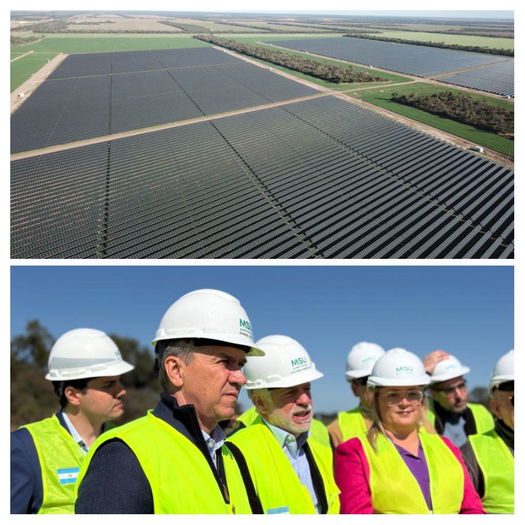 *Este viernes, en Pampa del Infierno, el gobernador Leandro Zdero junto al director de MSU Green Energy, Guillermo Marseillan y la intendente Glenda Seifert, estuvieron en el Parque solar que desde agosto de 2024 se encuentra operativo con una capacidad de 130 megavatios. Con 320 hectáreas y más de 220.000 paneles solares, es el tercer parque más extenso de la Argentina. Abastece a más de 90.900 hogares y cubre gran parte de la demanda del interior provincial.*