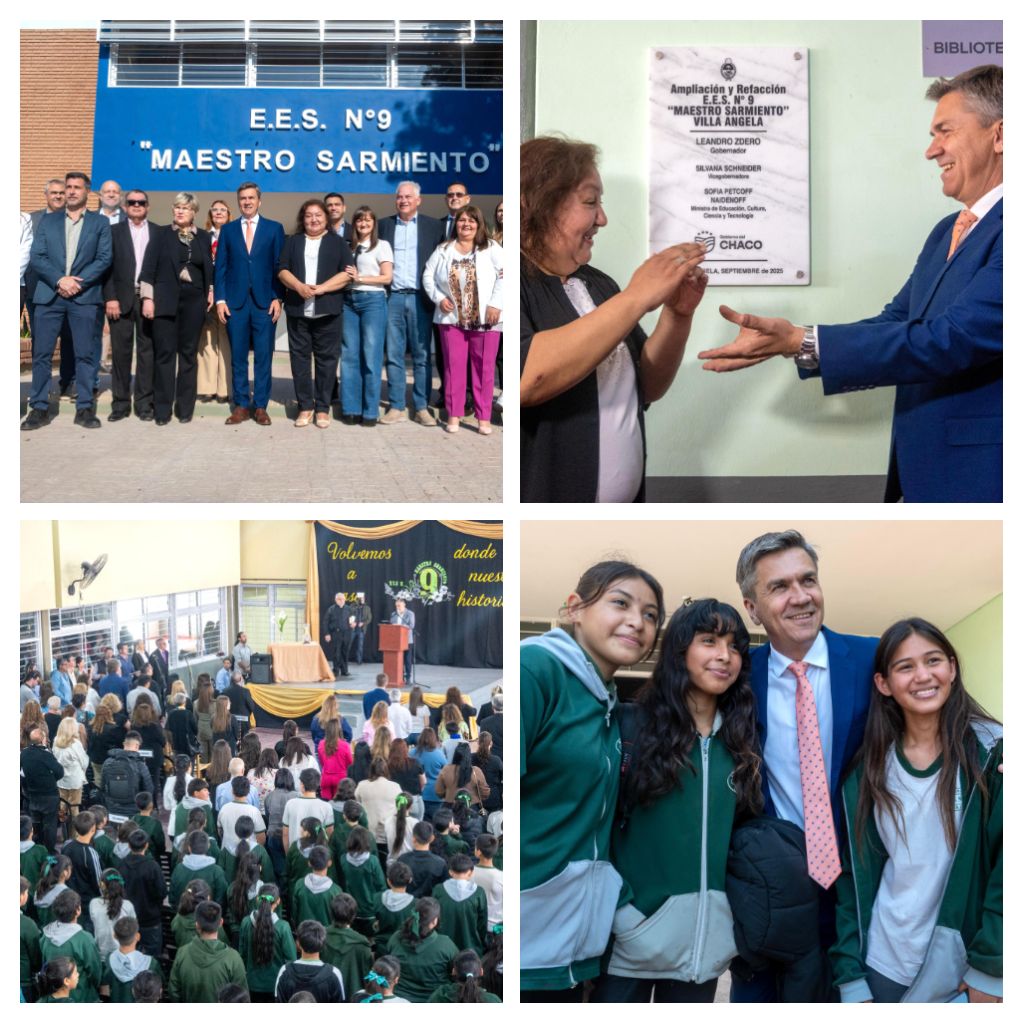 *UN DÍA HISTÓRICO: DESPUÉS DE 6 AÑOS, EL “BACHI” 9 DE VILLA ÁNGELA, VOLVIÓ A SU RENOVADO EDIFICIO* *Después de 6 años de espera, la comunidad de la Escuela Secundaria N° 9 (conocida como ‘Bachi’) pudo retornar a su nuevo edificio, refaccionado y ampliado. Por una decisión política del gobernador Leandro Zdero, esta obra se reactivó ni bien asumió la gestión y hoy compartió la alegría con esta comunidad, que tiene una matrícula de más de 500 estudiantes.* El gobernador Leandro Zdero, junto a la vicegobernadora Silvana Schneider, la ministra de Educación de la Provincia, Sofía Naidenoff, y la directora de la institución Karina Fernández, inauguraron este lunes en Villa Ángela la ampliación y refacción de la Escuela de Educación Secundaria Nº 9 “Maestro Sarmiento”, una obra muy esperada por esta comunidad. “Desde que asumimos la gestión sabíamos lo importante que era la esencia de que el ‘Bachi’ vuelva a tener a toda su comunidad educativa en este lugar”, sostuvo el gobernador en su discurso, señalando que el trayecto de formación de los estudiantes con los docentes y directivos, “es importante si están todos en el mismo lugar como comunidad educativa”, afirmó. Por eso, el gobernador afirmó: “Festejo que este sea el día de la unión de quienes estaban en diferentes instituciones”, comentando todas las situaciones que debieron pasar hasta llegar a la inauguración de este edificio. A la vez que sostuvo: “Tengo un gran respeto por los jóvenes del presente y los ciudadanos del futuro; hoy tienen la posibilidad que muchos chicos no tuvieron, de volver a estas aulas totalmente nuevas y no pierdan la oportunidad de disfrutar del mejor trayecto de formación que tenemos en nuestras vidas. La felicidad de ustedes es la de cada uno de nosotros, gracias por la confianza y la paciencia”, expresó Zdero. *HOY PUEDEN VOLVER, GRACIAS A LA DECISIÓN POLÍTICA DEL GOBERNADOR* La ministra Naidenoff en sus palabras manifestó su emoción por poder acompañar este acontecimiento de un edificio renovado para la comunidad de la EES N° 9, agradeciendo a los integrantes de esta institución, de la EET N° 1, al equipo de Infraestructura, a todos los que hicieron posible esta obra, que, sin dudas, contribuirá a ofrecer calidad educativa. Recordó que “la directora de la EES N° 9, con angustia relataba que en el 2019 se fueron de la escuela provisoriamente por la refacción” y que “recién hoy pudieron volver, gracias a la decisión política del gobernador Zdero, quien priorizó la reactivación y continuidad de esta obra”. Aseguró: “Esto no hubiese sido una realidad sin la decisión del gobernador“, teniendo en cuenta el estado de situación económica y financiera de la provincia y del país. Por otra parte, la ministra pidió el compromiso de los papás, de los estudiantes de esta institución para acompañar a los docentes para que practiquen y aprendan lectura comprensiva, “para que puedan pensar libremente”. ”Sé que esta institución va a ser ejemplo en lectura comprensiva, porque el ´Bachi´ tiene fuerza y compromiso con su comunidad”. Además, destacó que las familias chaqueñas cuentan con el Programa Fortaleza, impulsado por la vicegobernadora Silva Schneider, a través del cual se contienen a los jóvenes y a sus padres, brindando herramientas, para tratar o prevenir acerca de los consumos problemáticos. La EES N° 9 se encuentra al lado de la Escuela de Educación Técnica (EET) Nº 1, con la cual compartían espacios comunes, como sanitarios y salón de usos múltiples, durante esta obra de refacción y ampliación que significó una inversión con fondos provinciales. Cabe señalar que también la EET N° 1, donde además funciona la Escuela de Formación Profesional, fue refaccionada y se inauguró en marzo de este año; todas estas obras benefician a más de 1000 estudiantes. *ESTAMOS FRENTE A UN DÍA HISTÓRICO* Karina Fernández, directora de la EES N° 9, manifestó: “Somos una institución de 67 años, con una población estudiantil de 520. Históricamente de nuestras aulas salieron los maestros y esa es nuestra raíz, somos una institución madre de la que surgieron otras instituciones”. “Estamos frente a un día histórico, lleno de satisfacciones para nuestra comunidad educativa. Después de 6 años de esfuerzo y perseverancia, finalmente podemos celebrar el retorno a nuestro anhelado edificio”, expresó la directora. También estuvieron presentes el ministro de Infraestructura, Obras y Servicios Públicos, Hugo Domínguez; la subsecretaria de Infraestructura Escolar, Rosana Cerrutti; el subsecretario económico, Guillermo Agüero; la directora de la Regional Educativa 9, Milena Kek, supervisores, estudiantes, docentes, ex estudiantes y ex docentes.