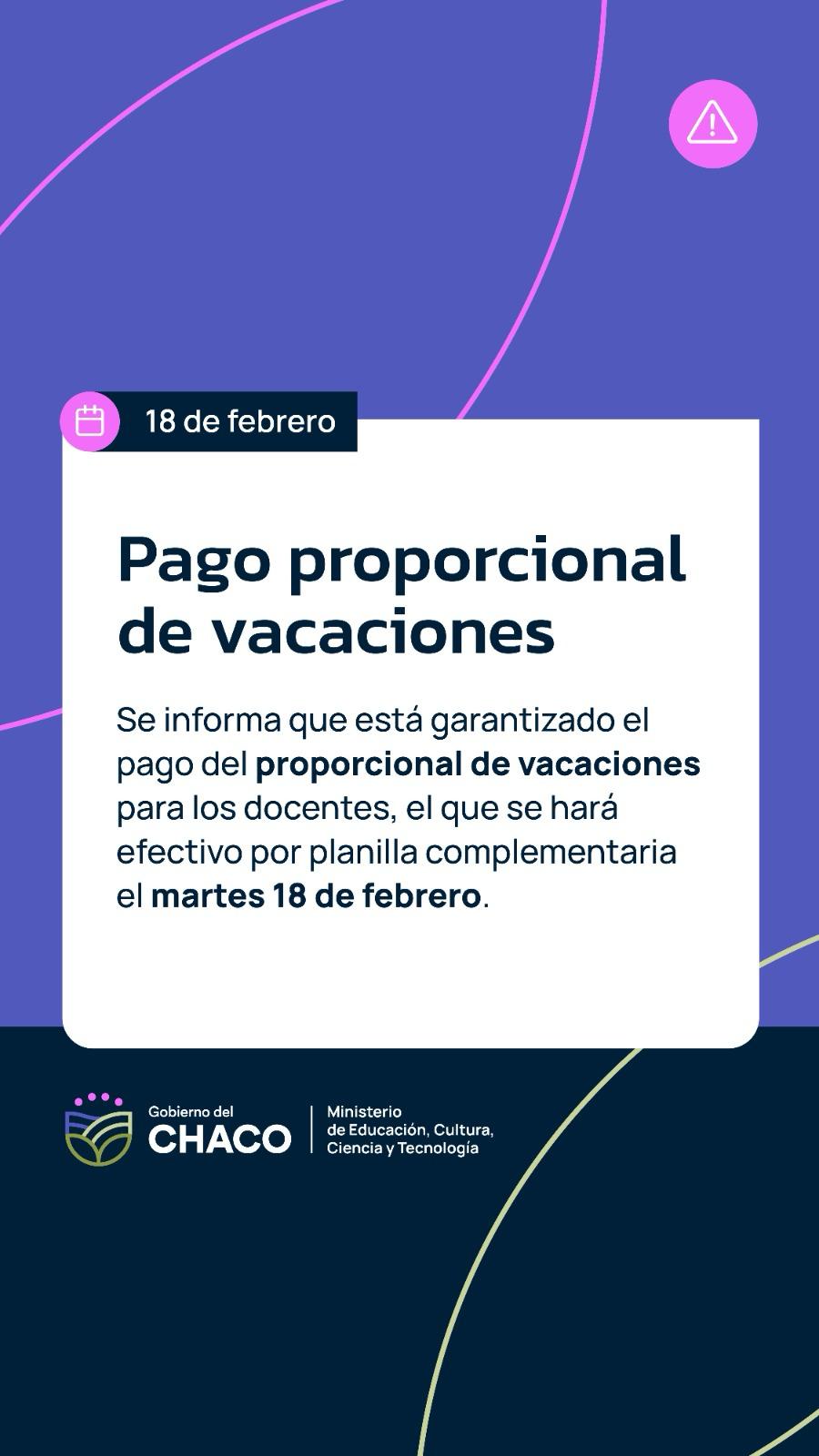 El Gobierno del Chaco, a trav�s del Ministerio de Educaci�n informa que est� garantizado el pago del proporcional de vacaciones para los trabajadores docentes, *el que se har� efectivo por planilla complementaria el 18 de febrero.*