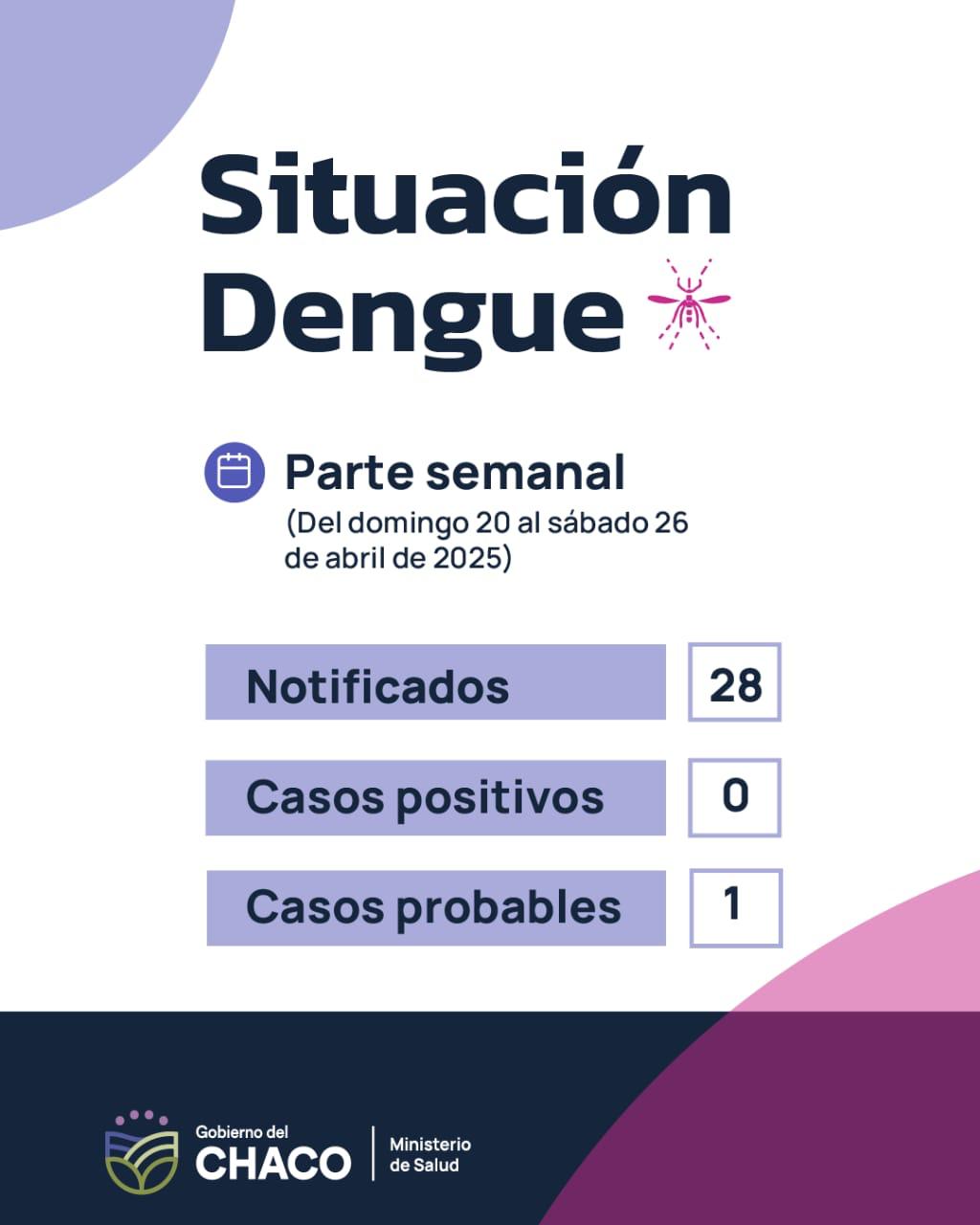 En ese periodo se recibieron 28 notificaciones, *0 casos positivos* y 1 caso probable de Charata.