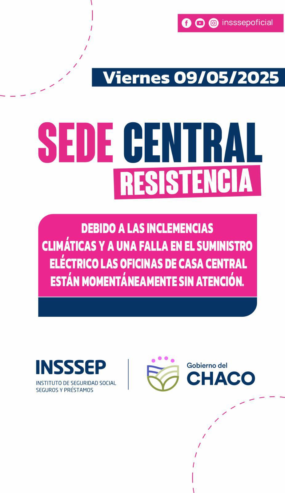 INSSSEP: ante una falla eléctrica se comunica que las oficinas de la Casa central en Resistencia, por el momento, están sin atención al público. La empresa Secheep ya se encuentra trabajando en el lugar para solucionar este inconveniente.