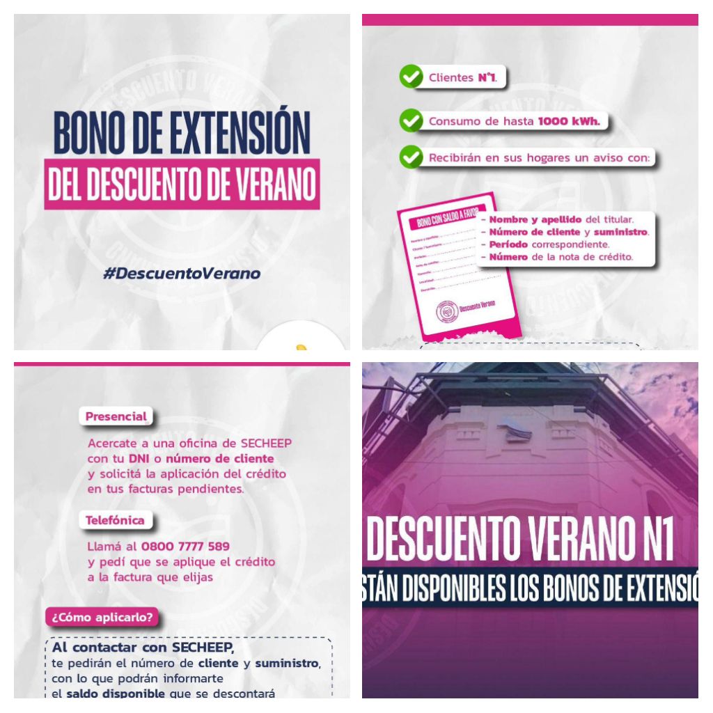 El Gobierno del Chaco, a través de Secheep, recuerda que el Bono de extensión del Descuento Verano sigue vigente y que los usuarios alcanzados por este beneficio *pueden hacer uso de las notas de crédito generadas por los consumos de enero y febrero.* La bonificación alcanza a los usuarios N2 (de ingresos bajos), N3 (de ingresos medios), pequeños comercios con consumos de hasta 1200 kWh por mes y, desde hace algunas semanas, también a los usuarios N1 (de ingresos altos) con consumos menores a 1000 kWh mensuales.