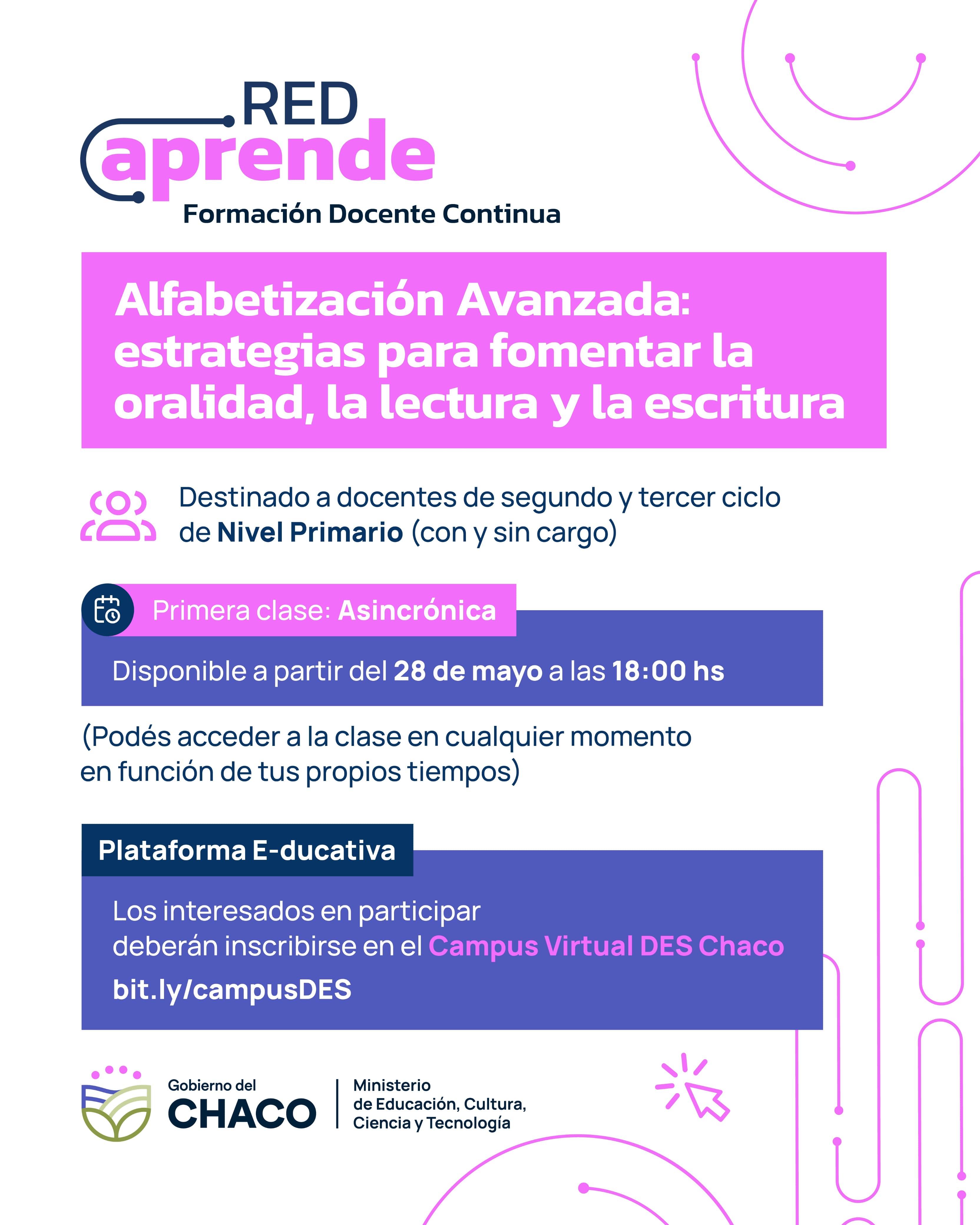 Este miércoles inicia el trayecto de capacitación Alfabetización avanzada: estrategias para fomentar la oralidad, la lectura y la escritura, en el marco del programa de formación docente Red Aprende. Está destinado a docentes con y sin cargo de segundo y tercer ciclo de Nivel Primario, y hasta el momento tiene más de cinco mil inscriptos